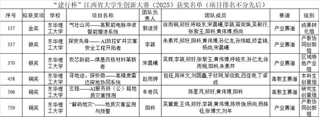 近日,江西省教育厅公布了“建行杯”江西省大学生创新大赛(2025)获奖名单,地球与行星科学学院参赛团队凭借出色的创新能力和扎实的项目成果,在本届大赛中表现亮眼,取得1金2银3铜的好成绩,创造学院历史最好成绩。