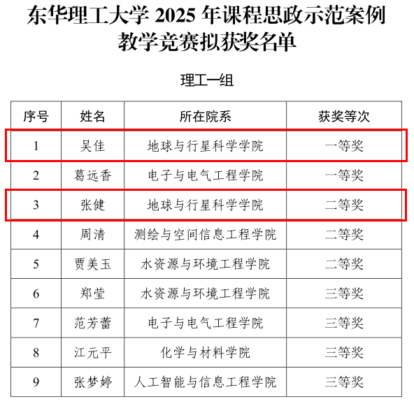 在10月21日举行的东华理工大学2025年课程思政示范案例教学竞赛中,地球与行星科学学院教师取得优异成绩。吴佳荣获理工一组一等奖,张健获得理工一组二等奖,关宝文和吴汪洋获得理工二组三等奖。此次竞赛展示了学院在课程思政建设方面的成果,体现了教师们将思政教育与专业教学深度融合的能力。